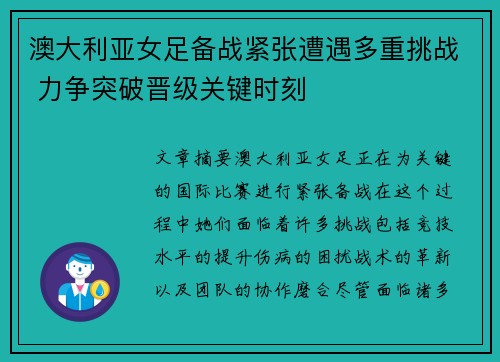 文章摘要:澳大利亚女足正在为关...